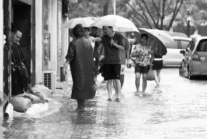 | 10月5日,受19号强热带风暴“尼格”影响,海口长时间持续降雨,造成多个小区严重积水。图为红城湖路上榆海华庭小区物业管理人员在堵水。 本报记者 张杰 摄 |