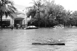 | 10月5日,暴雨中的海口市华庭路一片汪洋,造成四季华庭小区居民出行难。