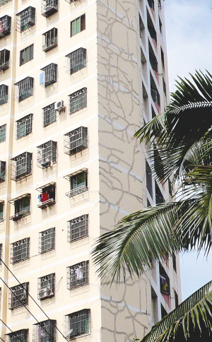 | 10月14日,海口府城一栋楼外墙壁上满是解决防水防漏填补上去的“裂缝”。 本报记者 张杰 摄 |
