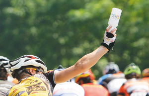 | 21日,南非MTN洲际队的123号车手举着水瓶示意要求队车提供供给。