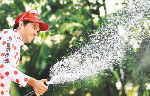 | 21日,第二赛段“爬坡王”拉脱维亚马赛洲际队的安东玛奇开香槟庆祝胜利。