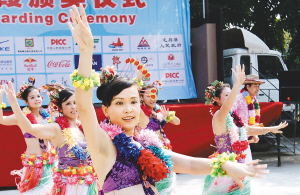 | 21日,2011环海南岛国际公路自行车赛第二个赛段(五指山-琼中-兴隆)的比赛顺利结束,比赛全程146.4公里。图为在第二赛段的颁奖仪式上,演员们在表演独具特色的东南亚风情舞蹈。 本报记者 宋国强 摄 |