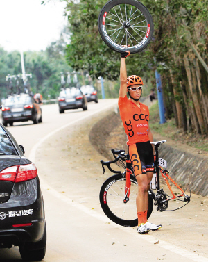 22日,在第三赛段的比赛中,波兰美利达自行车洲际职业队队员在等待更换轮胎。 本报记者 宋国强 摄