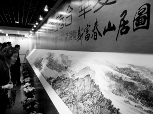 10月22日,“杭台书画名家作品展暨《新富春山居图》画展”在杭州的浙江图书馆举行,共有两岸书画家的120余幅作品参展。《新富春山居图》由两岸知名书画大师联袂创作,体现了当代书画艺术的传承与创新。图为参观者在浙江图书馆展厅观看《新富春山居图》。 新华社发