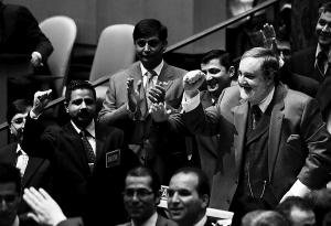 10月21日,第66届联合国大会经过9轮不记名投票,选举摩洛哥、多哥、巴基斯坦和危地马拉4国为2012—2013年度安理会非常任理事国。第5个安理会非常任理事国的席位当天没有结果,投票将于24日继续进行。图为巴基斯坦代表庆祝该国当选安理会非常任理事国。 新华社发