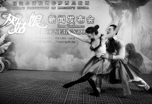 | 国家大剧院版歌剧《灰姑娘》演员在新闻发布会上展示该剧第一幕中的“爱情双人舞”片段。 新华社发 |