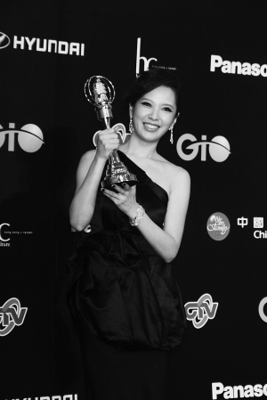 10月21日,第46届台湾电视金钟奖颁奖典礼在台北举行。戏剧节目男女主角奖分别由潘玮柏和天心获得,综艺节目主持人奖由新锐浩角翔起———浩子(谢炘昊)、阿翔(陈秉立)获得。 图为天心凭借《我的完美男人》获得戏剧节目女主角奖。 新华社发