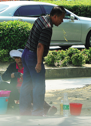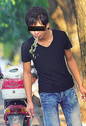 10月23日,海口市南海大道明光大酒店前的槟榔摊点,一行人在乱吐。 本报记者 古月 摄