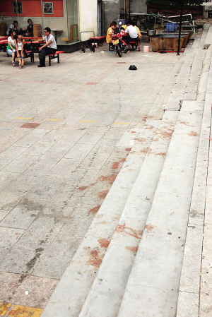 在昌江黎族自治县石碌镇南国超市的台阶上,槟榔汁留下了抹不掉的“血染的风采”。 本报记者 杨勇 摄