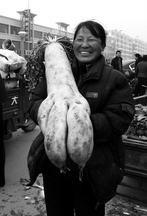 山西省朔州市朔城区牛家店村农民段银娥在自家院里用农家肥种出了一根特大白萝卜。这个萝卜重24斤、直径18厘米、长达80厘米。 新华社发