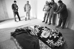 | 几名男子在利比亚的米苏拉塔为卡扎菲(右)和其儿子穆塔西姆的尸体拍照。 新华社记者 李木子 摄 |