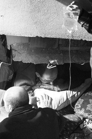 | 10月23日,在土耳其东部凡省埃尔吉斯,当地民众为一名困在废墟中的男子打点滴。这名男子最终不幸遇难。 新华社/法新 |