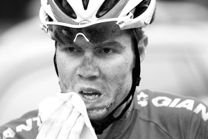 | 24日,在当天的比赛中,天空不时下雨,车手在雨中竞技。图为澳大利亚最派克洲际队一队员在擦脸上的尘土。 本报记者 宋国强 摄 |