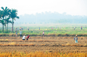 10月24日,琼海市万泉镇的群众正在稻田里种植瓜菜。当日是农历二十四节气“霜降”,此时此刻,北方部分地区不时传来降温消息,海南却是阳光普照秋色宜人。 特约记者 蒙钟德 摄