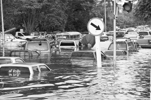 | ←在泰国中部大城府,汽车浸泡在洪水中。 |