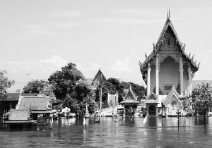 | ← 在泰国中部大城府,一座寺庙遭到洪水侵袭。 |