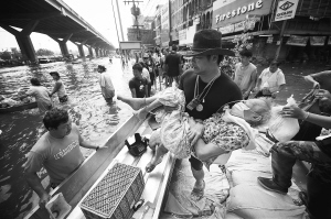 | ←在泰国首都曼谷郊区,居民受洪灾影响涉水撤离家园。 |