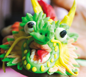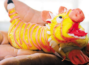 | ← 陈世强制作的周岁粿造型可爱、栩栩如生。 本报记者 洪宝光 摄 |