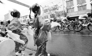 在第五赛段比赛中,澄迈县的小学生敲着腰鼓欢迎自行车选手。