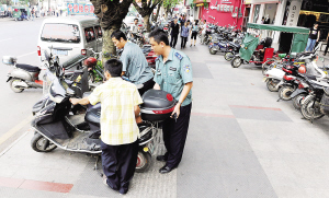 | 11月2日下午,海口市琼山区府城镇城管执法人员纠正乱停放的电动车。当天上午,琼山区召开全区动员大会,号召市民积极行动起来“争做文明海南人、争创文明大环境”,自觉抵制不文明行为。 本报记者 古月 通讯员 龙泉 摄