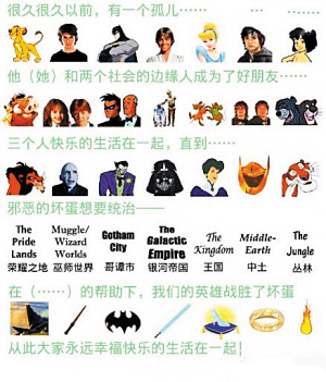 继续往下看,“他(她)和两个社会的边缘人成为了好朋友……”这些“好朋友”你应该也不陌生———辛巴的好朋友就是一头小野猪,哈利·波特的好朋友是赫敏和罗恩……“三个人快乐地生活在一起,直到……”这句没说完,但你应该也能补充完整,因为下面一行出现的全是你“耳熟能详”的坏蛋———刀疤叔叔,伏地魔,坏皇后……紧接着,“邪恶的坏蛋想要统治……”这个你可能会记不太清楚了,但不会影响理解,图上也用中英文对应注明———荣耀之地、巫师世界、王国等。看到这,你会开始惊讶了吧,怎么归纳了这么多,这些电影都还能接得上呢!别急,还没结束呢,接下来自然是“在……的帮助下,我们的英雄战胜了坏蛋!”灰姑娘靠的是水晶鞋,哈利·波特靠的是魔杖,精灵王子靠的是魔戒……最后大结局———从此大家永远幸福快乐地生活在一起!