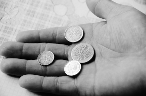 | 刘大军展示老人给的游戏币、港币、日币和一分钱硬币。 新华社发 |