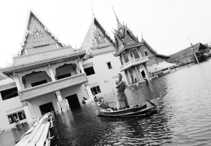 | 僧侣划船离开洪水淹没的寺庙。 新华社/路透 |