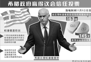 据新华社雅典11月5日电 (记者陈占杰 刘咏秋)由总理帕潘德里欧领导的希腊政府5日凌晨以153票支持、145票反对赢得议会信任投票。