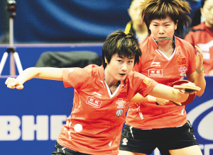 | 李晓霞(右)和丁宁在世界杯团体赛女双比赛中。 新华社发 |