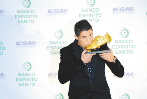 北京时间11月5日,上赛季在各项赛事中打入40球的皇马球星克里斯蒂亚诺·罗纳尔多在马德里接过了2010-2011赛季欧洲金靴奖的荣誉。图为C罗在颁奖仪式上亲吻金靴。 新华社发