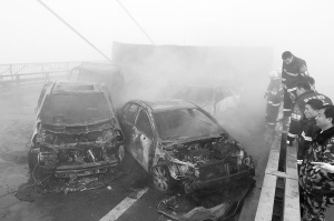 11月6日在哈尔滨市四方台大桥拍摄的9车连撞事故现场。 当日7时许,黑龙江省哈尔滨市四方台大桥发生一起9车连撞事故,造成8车严重烧毁,1人死亡,4人受伤。 新华社发