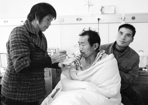 | 11月6日,在义煤集团总医院病房中,家人正在给获救矿工姚铁喂饭。 新华社发 李博 摄 |