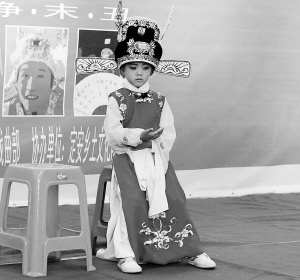 每个周末,定安县定城镇文明路群众戏剧大舞台上,都会有一名6岁的小男孩来到这里,登台献上一两段琼剧片段,他的名字叫林道灼(见右图,记者洪宝光摄),是定安第一小学一年级学生。