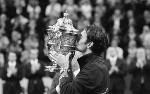 瑞士“天王”费德勒6日在瑞士室内赛中以2:0击败日本新星锦织圭,夺得冠军,从而结束了自2002年以来时间最长的十个月的“冠军荒”。图为费德勒举起冠军奖杯。 新华社发