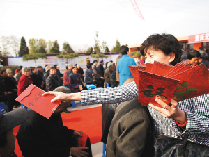 11月7日,工作人员在向河北省唐山市古冶区卑家店镇刘庄村和滦县九百户镇小河湾村的老人们发放养老金。 旅澳侨胞董配永向家乡两村———河北省唐山市古冶区卑家店镇刘庄村和滦县九百户镇小河湾村60岁以上老人捐赠养老金活动启动,每位在册的60周岁(含)以上老人按照年龄不等每人每月可领取300元-1600元,100周岁以上者每人每月可领取2000元,为农村老人安享晚年增添了保障。 新华社发