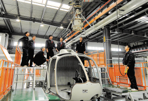 11月7日,工作人员在为一架AC311型直升机安装主减速器。 中航直升机有限责任公司天津基地一期工程建成并投入使用1年多来,累计下线近10架直升机,预计明年将生产各类直升机20余架。到2015年,中航直升机将实现年产各类直升机300余架,成为全球直升机主要供应商之一。 新华社记者 张超群 摄