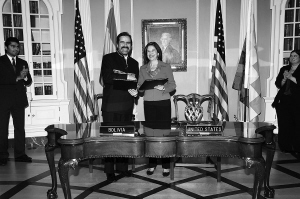 僵持3年后 玻利维亚与美恢复外交 11月7日,在玻利维亚拉巴斯,玻利维亚外交部副部长胡安·卡洛斯(左二)与美国负责民主和全球事务的副国务卿玛丽亚·奥特罗(右二)签订协议后握手。 据玻利维亚官方通讯社当日报道,玻利维亚当天与美国在华盛顿签订了一项框架协议,根据协议,两国将恢复合作关系,并尽快互派大使。此举标志着僵持了3年的两国外交关系开始解冻。 新华社/路透