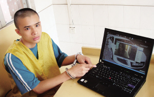 | 图为犯罪分子指认其通过软件截取一段当事人的视频,通过该视频对该当事人的朋友进行QQ诈骗(6月14日摄)。 新华社记者 梁志玮摄 |