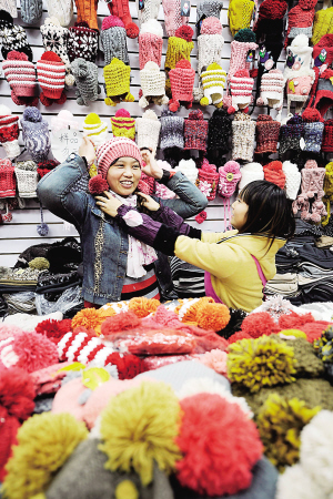 | 11月8日,在银川市某商场内,一名市民在选购冬季御寒的帽子。