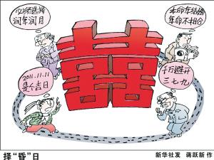 记者注意到今年的“光棍节”俨然变身“结婚日”。“六个1相连,3对‘11’寓意着‘一男一女’‘一生一世’‘一心一意’。”准备11日结婚的小李说。据了解,11日或将成为继2008年8月8日“奥运婚”、2009年9月9日“天长地久婚”、2010年10月10日“十全十美婚”之后的“一生一世婚”,中国多个地市的婚姻登记处咨询人数近日渐多,婚宴酒席更是一席难求。