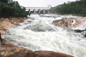 11月8日,我省中西部的儋州、白沙、琼中等市县普降暴雨,使处于饱和状态的松涛水库水位急剧上涨,截至9日上午8时,松涛水库水位已到了警戒线。在省防总的指挥下,松涛水库启动四孔闸门再度泄洪。松涛水库建库53年来首次在一个月内两次泄洪。图为11月9日下午2时的泄洪情景。 吴文生 摄