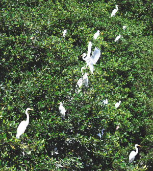 十一月十日,在三亚红树林公园,一群群白鹭飞翔在河边红树林中,嬉戏觅食。这个冬天,红树林公园成了白鹭的新家。 特约记者 孙清 摄