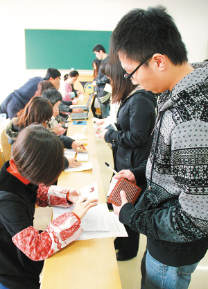 11月10日,在2012年全国硕士研究生统一入学考试江苏大学报考点,报名考生进行身份验证。根据教育部的统一部署,从当日起至14日,2012年全国硕士研究生统一入学考试报名进入现场确认阶段。在此期间,报名考生须持个人有效身份证件、学历证书、网上报名编号等规定材料到网上报名选定的报考点确认报名信息、接受身份验证、缴纳报考费和进行图像信息采集,以完成报名流程。 新华社发(杨雨 摄)