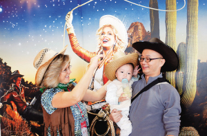 11月12日,在2011中国体育旅游博览会国际友好城市展区,美国斯科茨代尔市展台内,海口市民带上西部牛仔帽与展台工作人员合影。 本报记者 宋国强 摄 (体博会更多报道见A8版)
