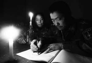 | 王继才夫妇在烛光下写每天都要记录的巡岛日志(11月1日摄)。 |