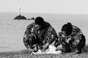 | 王继才夫妇在闲暇时与陪伴他们的小狗玩耍(11月2日摄)。 |