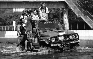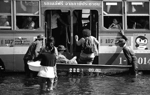 11月12日,在泰国曼谷,人们乘坐卡车行进在被积水淹没的街道上。 人们乘坐摆渡船登上一辆公交车。 新华社/法新