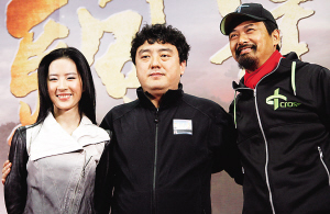 电影《铜雀台》日前在京举办媒体见面会,饰乱世枭雄曹操的周润发(右)首次亮相,与导演赵林山(中)、女主演刘亦菲合影。 新华社发