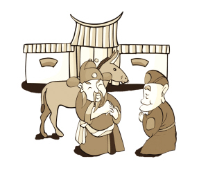 | 明代临高人谢宁,性情谦卑而滑稽,遇见乡人无论老少皆鞠躬行礼;他常牵着一匹马随身。
