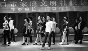 11月13日,在海口市中心幼儿园,海口市“五好文明家庭”的成员在进行文明礼仪训练。当天,海口市妇联对2010年度60户“五好文明家庭”进行表彰,其中10户家庭获“五好文明家庭”标兵户、10户家庭获“优秀读书家庭”、10户获“优秀环保家庭”称号。 本报记者 张杰 摄
